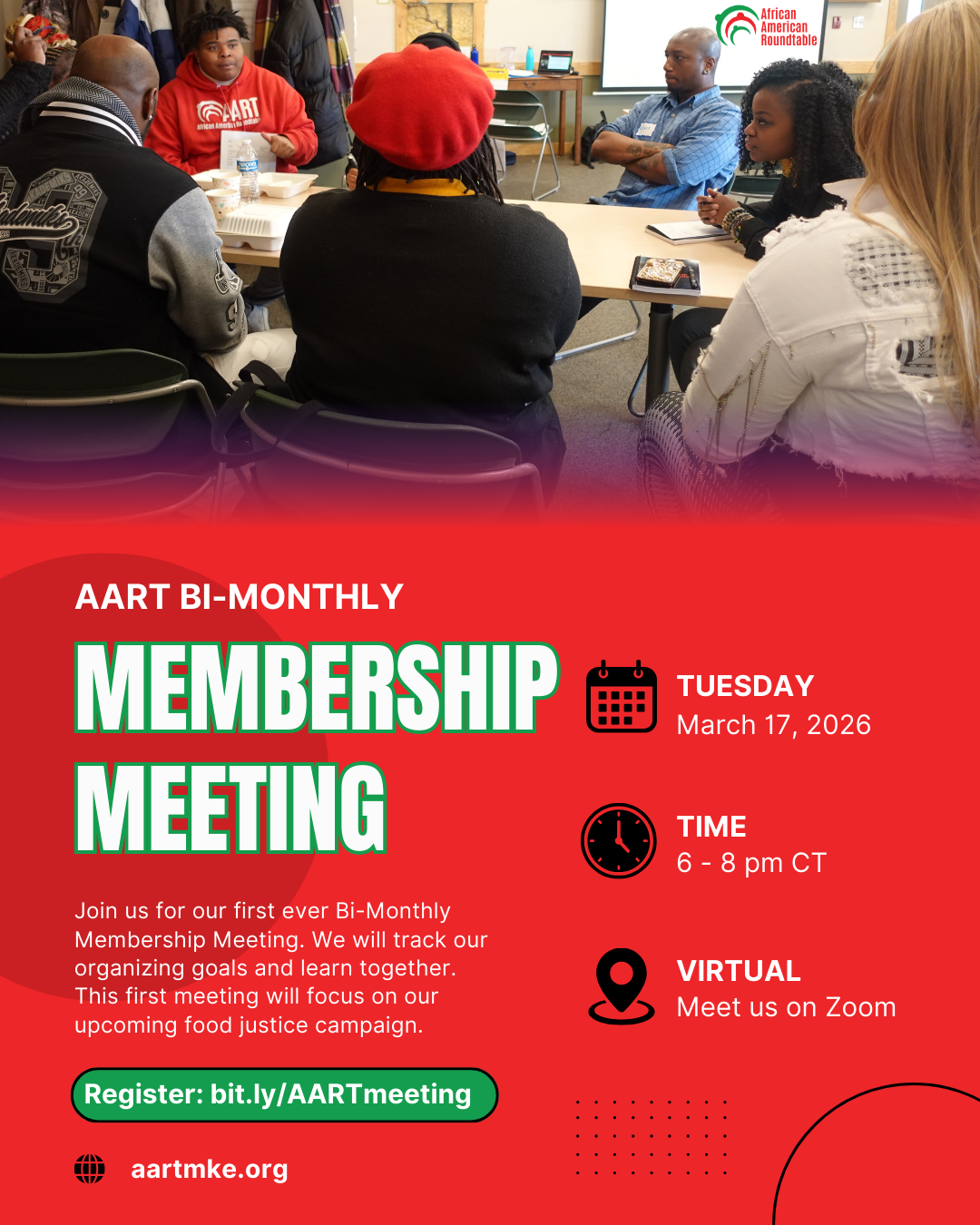 AART Bi-Monthly Membership Meeting Tuesday, March 17, 2026 6:00 PM 8:00 PM Google Calendar ICS Join the African American Roundtable (AART) on March 17 for our first ever Bi-Monthly Membership Meeting! We will track our organizing goals and learn together. This first meeting will focus on our upcoming food justice campaign. Register here: https://bit.ly/AARTmeeting. See you there!
