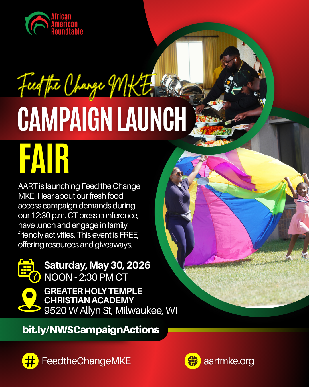 Join AART and our neighbors on Saturday, May 30 at Greater Holy Temple Christian Academy between noon and 2:30 p.m. CT for the launch of our Northwest Side-led food access campaign: Feed the Change MKE. This event will include free food, giveaways, food-based resources, family activities, and a 12:30 p.m. CT press conference about our campaign.
